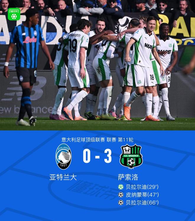 北京时间11月9日,意大利足球顶级联赛第11轮,亚特兰大主场迎战萨索洛。上半场皮纳蒙蒂造点,贝拉尔迪主罚命中。下半场贝拉尔迪助攻皮纳蒙蒂破门,之后贝拉尔迪单刀破门完成双响。最终亚特兰大0-3不敌萨索洛遭遇联赛7轮不胜。
