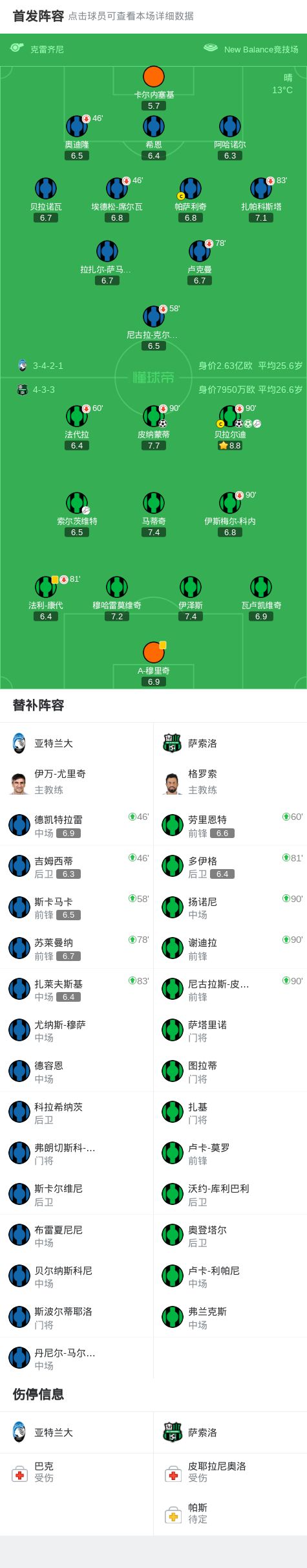 第29分钟,皮纳蒙蒂造点,贝拉尔迪主罚命中,萨索洛1-0亚特兰大